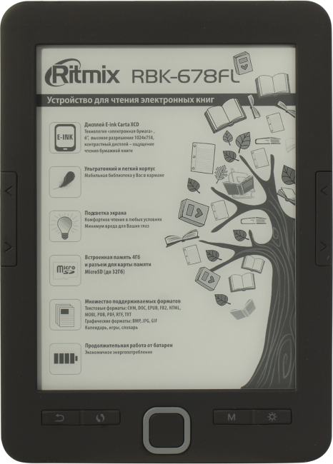 Ritmix <RBK-678FL> (6",mono,подсв,1024x758, 4Gb,CHM/DOC/EPUB/FB2/HTML/MOBI/PDF/RTF/TXT/BMP/JPEG/GIF,microSD,USB)